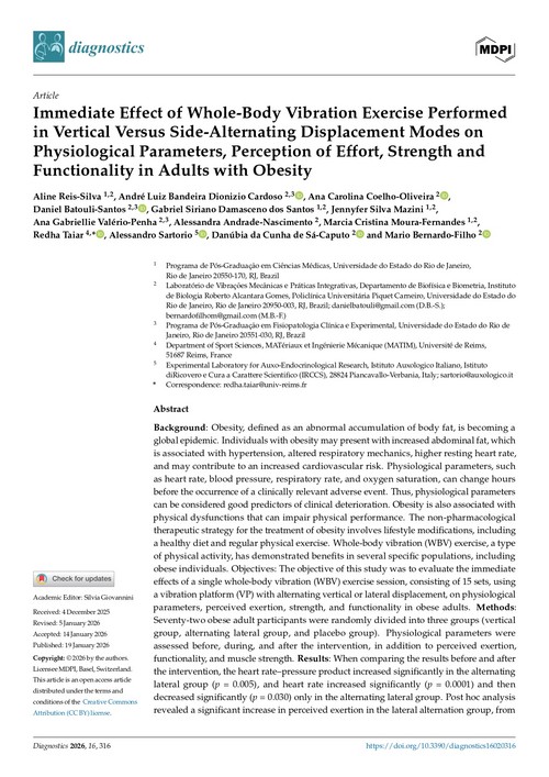Immediate effect of whole-body vibration exercise performed in vertical versus side-alternating displacement modes on physiological parameters, perception of effort, sttength and functionality in adults with obesity.