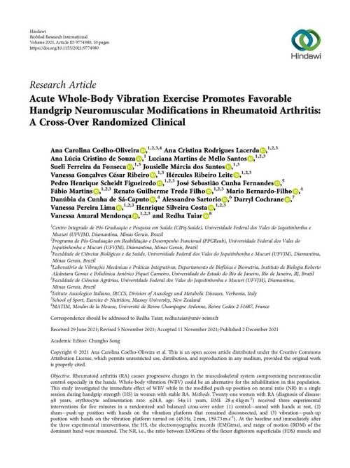 Acute whole-body vibration exercise promotes favorable handgrip neuromuscular modifications in rheumatoid Arthritis: A Cross-Over Randomized Clinical.